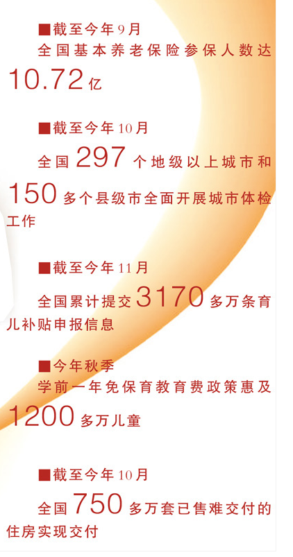 幼有所育、学有所教、劳有所得、病有所医、老有所养、住有所居、弱有所扶,是牵动亿万家庭的民生关切。300多个地级市和人口大县建设托育综合服务中心;学前教育毛入园率达到92%,高等教育毛入学率达到60.8%;跨省异地就医直接结算惠及5.6亿人次;居民人均预期寿命达到79岁;脱贫人口务工就业规模连续4年稳定在3000万人以上……