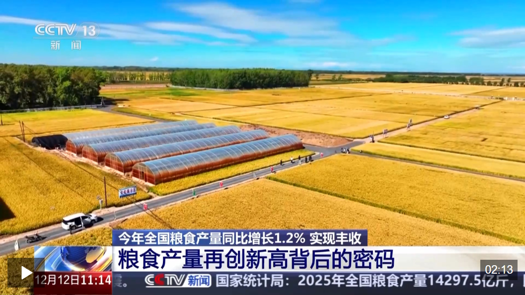 国家统计局今天发布最新的粮食数据显示,2025年全国粮食总产量14298亿斤,比上年增长1.2%。全国粮食播种面积比2024年增加90千公顷(135万亩),全国粮食单位面积产量比2024年增加65.7公斤/公顷(4.4公斤/亩),增长1.1%。