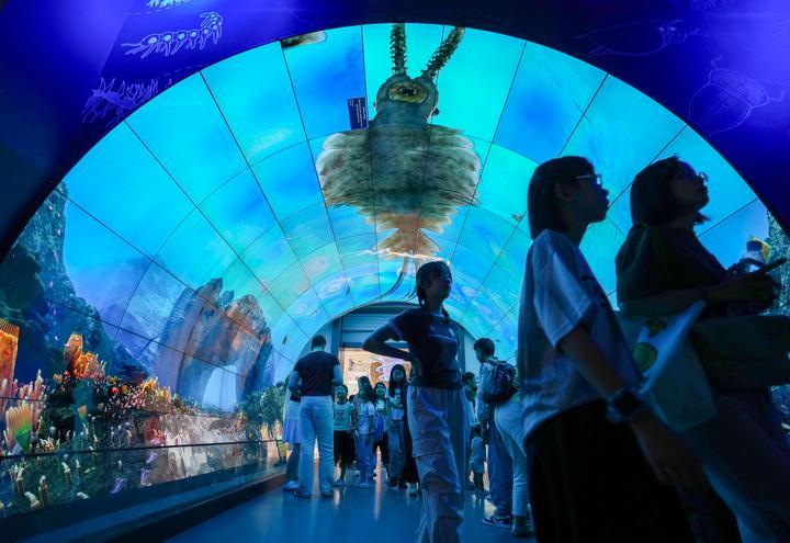 2025年7月15日,游客在玉溪市澄江化石地世界自然遗产博物馆“寒武纪海底隧道”参观。