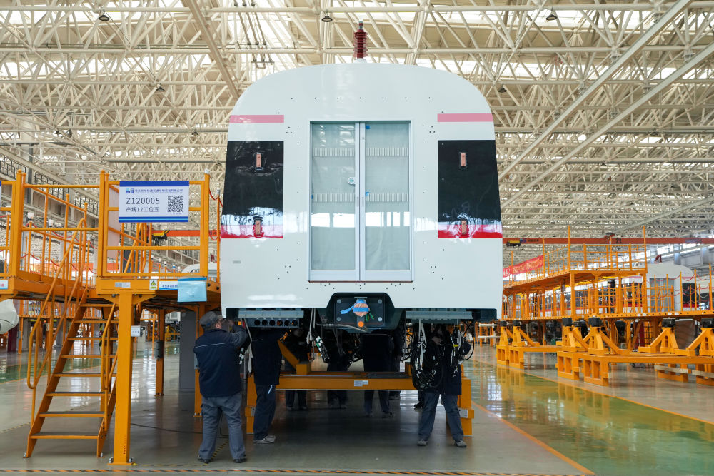 在京投装备河北京车智能制造基地,工作人员在地铁列车总装车间内工作(2025年2月14日摄)。京投装备河北京车智能制造基地位于河北省保定市,采用“北京研发+河北制造”模式运营,是贯彻京津冀协同发展战略的重要项目。新华社记者 鞠焕宗 摄