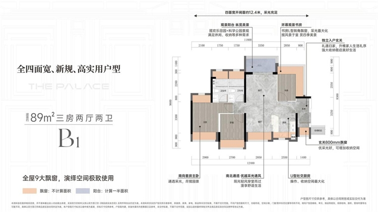 这是目前市面上稀有的89㎡拥有独立入户玄关且客餐厅和主卧南北双通透的户型。客餐厅与主卧实现南北双通透,且全屋九大飘窗赠送面积约17.45㎡;主卧套房则采用南北双飘窗,开间约3.6米,轻松容纳1.8米大床,完美契合当下城市购房者的全新需求,生活体验感因此而跃升。