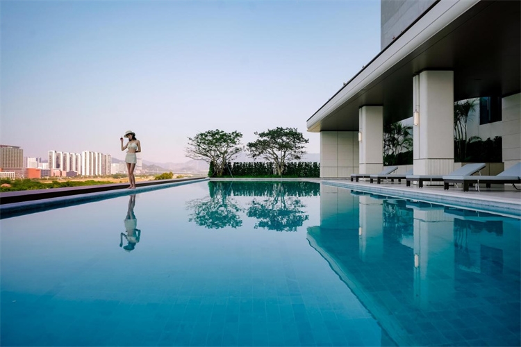 无边际泳池更是项目的点睛之笔。位于三楼的无边际泳池,以湄南河四季酒店为蓝本,成人池长约26米、宽约7.6米,搭配约60cm深儿童戏水池。池底铺贴东南亚顶奢酒店同款侘寂灰石材,注水后呈现天然浅蓝色泽,与科学公园的远山绿意形成视觉呼应。泳池西北侧直面科学公园“光明顶”,夜晚可俯瞰城市星光,营造“空中度假”氛围。
