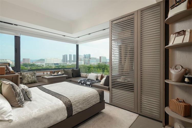 客厅通过拆除非承重墙,形成堪比140㎡大平层的大方厅格局,如此一来,LDKB客餐厅一体化设计使整个空间成为了一个“家庭互动场”,为家人间游戏、观影、学习提供了自如的场地。而主卧最惊艳的是长约8-9米的L型环幕飘窗,如同把IMAX影院搬进卧室,可打造成阅读角或梳妆区。