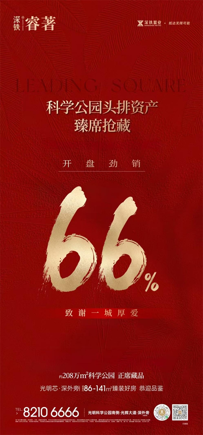 时逢岁末,深圳房地产市场暖意渐浓。12月20日,深铁置业在光明中心区打造的品质住区——深铁睿著项目正式开盘,首日去化率达66%,成为年末深圳楼市“现象级”热销案例。