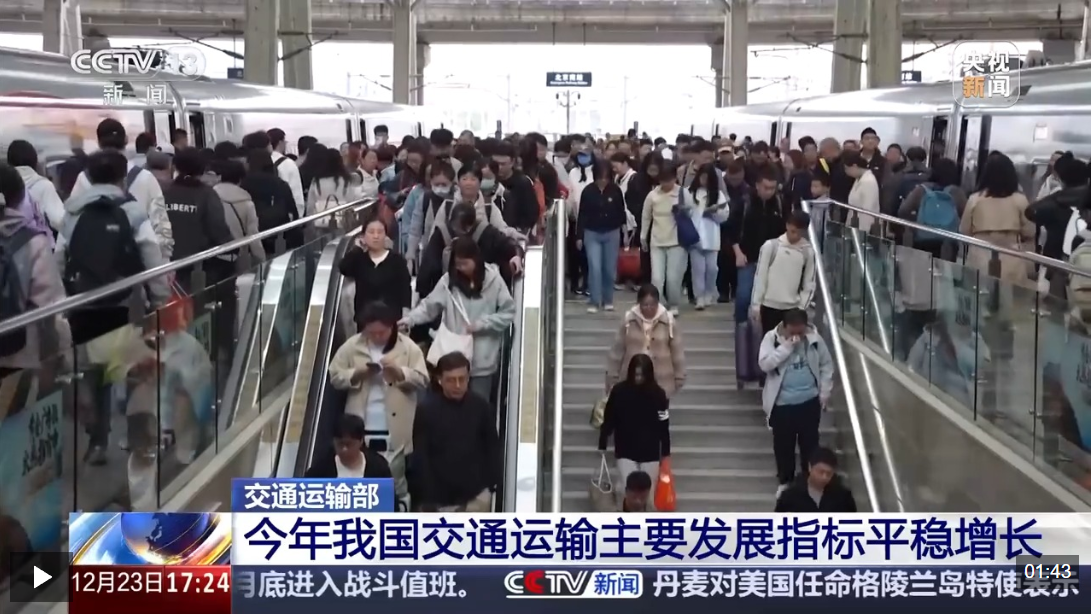 交通运输主要发展指标平稳增长。预计今年完成交通固定资产投资超3.6万亿元,新增高速铁路超2000公里、高速公路约8000公里、高等级航道约900公里,新颁证民用运输机场5个。跨区域人员流动量超660亿人次,完成营业性货运量超580亿吨,同比均增长3.5%左右。港口外贸集装箱吞吐量增长约9.6%,国际航空货运增长20%,快递业务量增长13.5%左右。