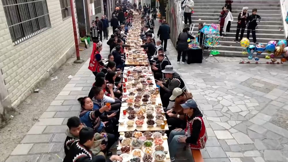 新年伊始,位于云南省红河哈尼族彝族自治州元阳县俄扎乡的哈播村,当地哈尼族群众迎来了一年一度的“昂玛突”节。村民们将梯田鱼、竹虫、干巴等特色美食摆上餐桌,数百桌美食桌连桌,凳连凳,沿街一字排开,宛如长龙在村里蜿蜒。