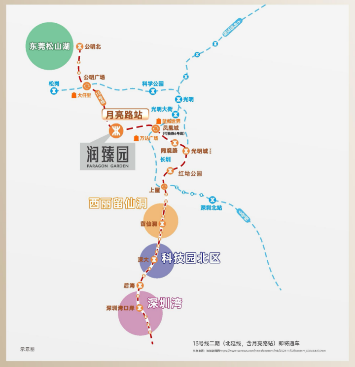 对于润宏城业主而言,高效通勤直接放大区域价值,轨道红利触手可及。从月亮路站出发,9站直达深圳湾总部基地等核心就业区,1站换乘6号线通达福田中心,真正融入半小时湾区生活圈。更值得期待的是,13号线二期北延段已完成全线热滑试验,进入动车调试阶段,预计2026年具备通车条件。届时,从润宏城出发10站直达留仙洞总部基地,全程仅需约30分钟。“住在光明,工作在南山”的理想生活将全面落地。