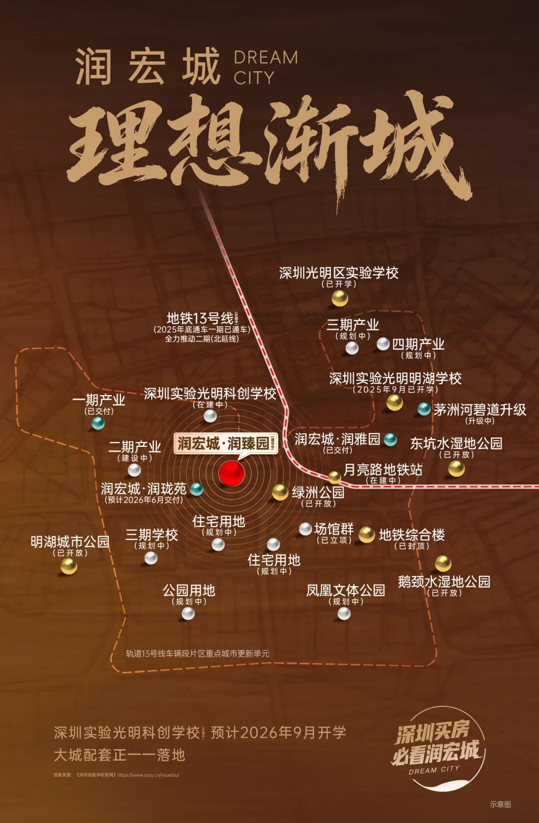 当轨道的轰鸣唤醒城市的脉络,当大城的兑现勾勒生活的蓝图,深圳光明正迎来属于润宏城的“高光”时刻。近日,深圳地铁13号线一期北段正式开通,二期北延段全力推进,这条被誉为“科创干线”“南北通勤动脉”的黄金线路,即将重塑湾区通勤格局。而与13号线月亮路站(在建)直线距离约600米的润宏城,正以320万㎡大城体量,兑现 “轨道改变生活,大城兑现美好”的核心承诺,让光明与南山的半小时生活圈成为现实。