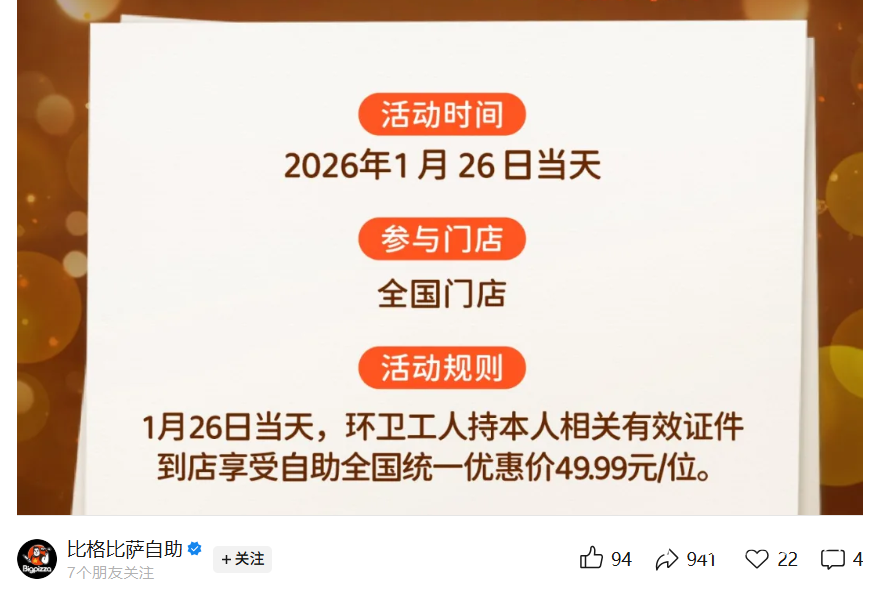 根据“比格比萨自助”官方公众号1月14日的发文,企业将1月26日定位“比格环卫工人福利日”,称在当天给环卫工人发放福利,环卫工人持本人相关有效证件等到店可以享受49.99元的自助餐优惠价,原价每人79.99元。