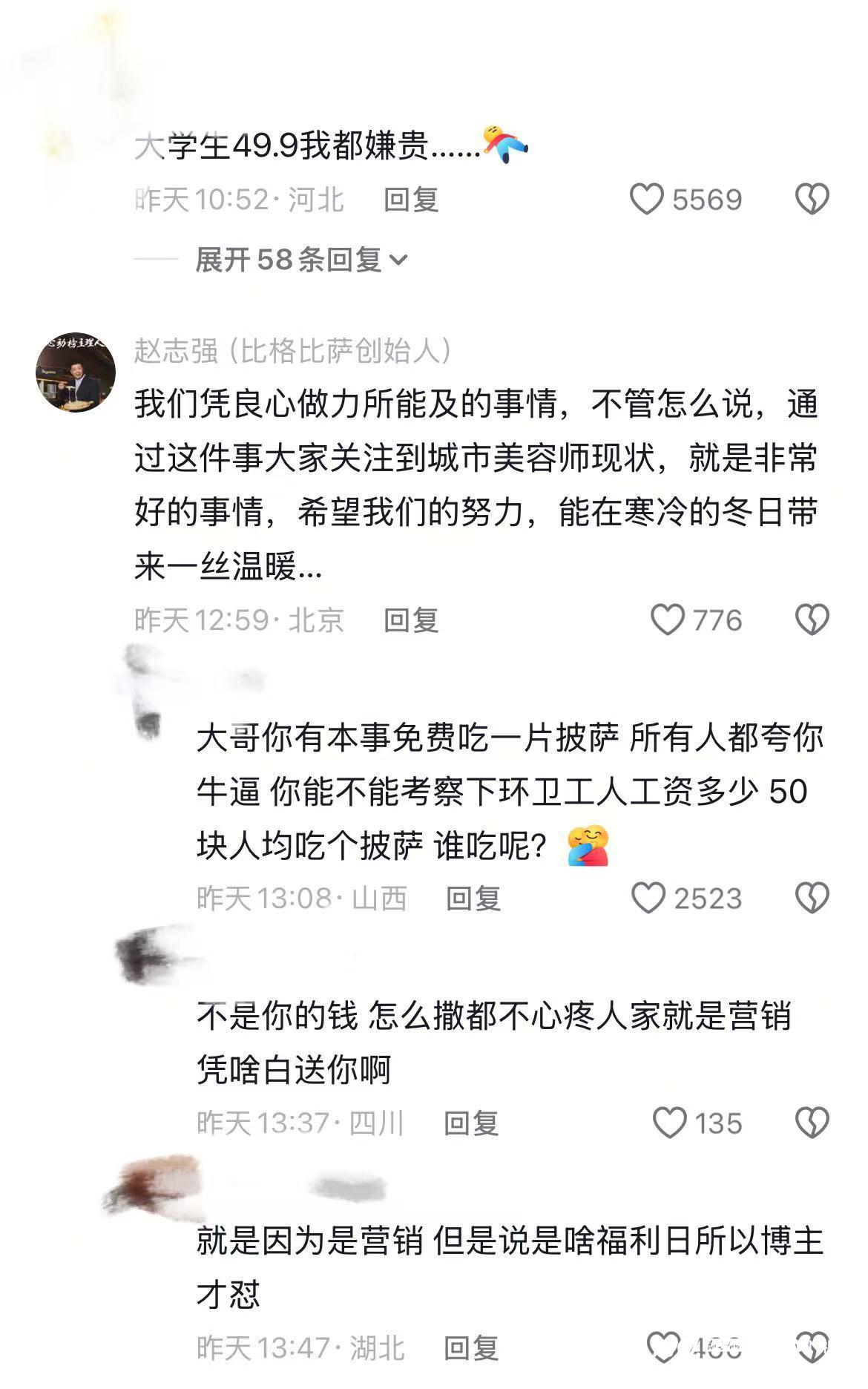 1月16日,比格比萨创始人赵志强向南都湾财社记者表示,活动本意是借此让更多人关注环卫工人这个群体,这本身就是一件好事,也希望大家帮助环卫工人做一点实事,并称企业目前只踏踏实实做好经营服务,“没什么其它好说的了”。另据媒体报道,赵志强曾称,49.9元已经基于最低成本推出的优惠价。
