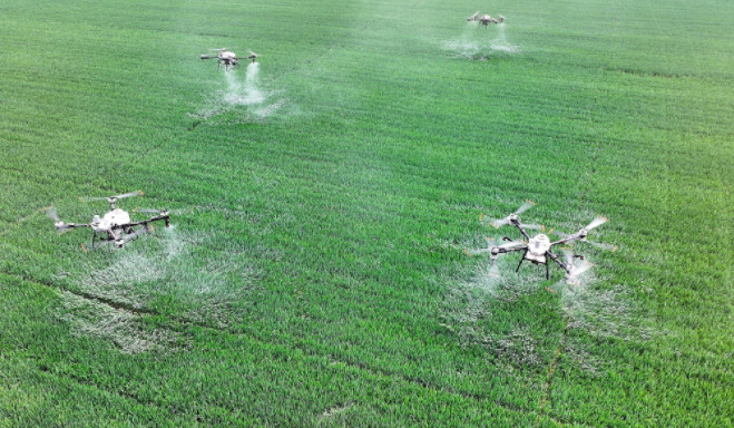 2025年4月9日,安徽省亳州市利辛县永兴镇诸王社区,种粮大户利用植保无人机给小麦喷洒药物。