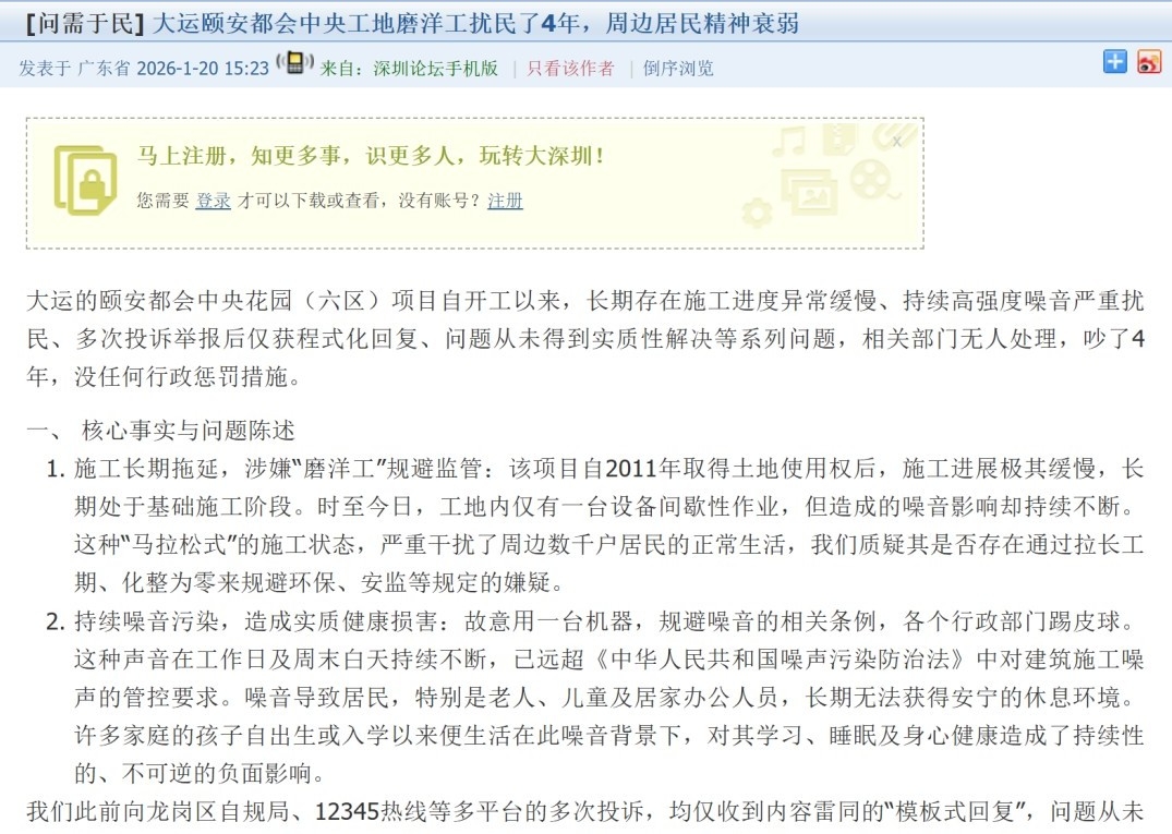 奥一新闻记者关注到,近日有深圳市民在“深圳论坛”上反映龙岗区大运片区的颐安都会中央花园(六区)项目,自开工以来长期存在施工进度异常缓慢、持续噪音严重扰民、投诉后问题难以实质解决等情况,周边居民生活备受困扰。