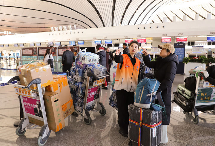 2月2日,安检志愿者在北京大兴国际机场协助旅客进行宠物托运。新华社发(王贺 摄)