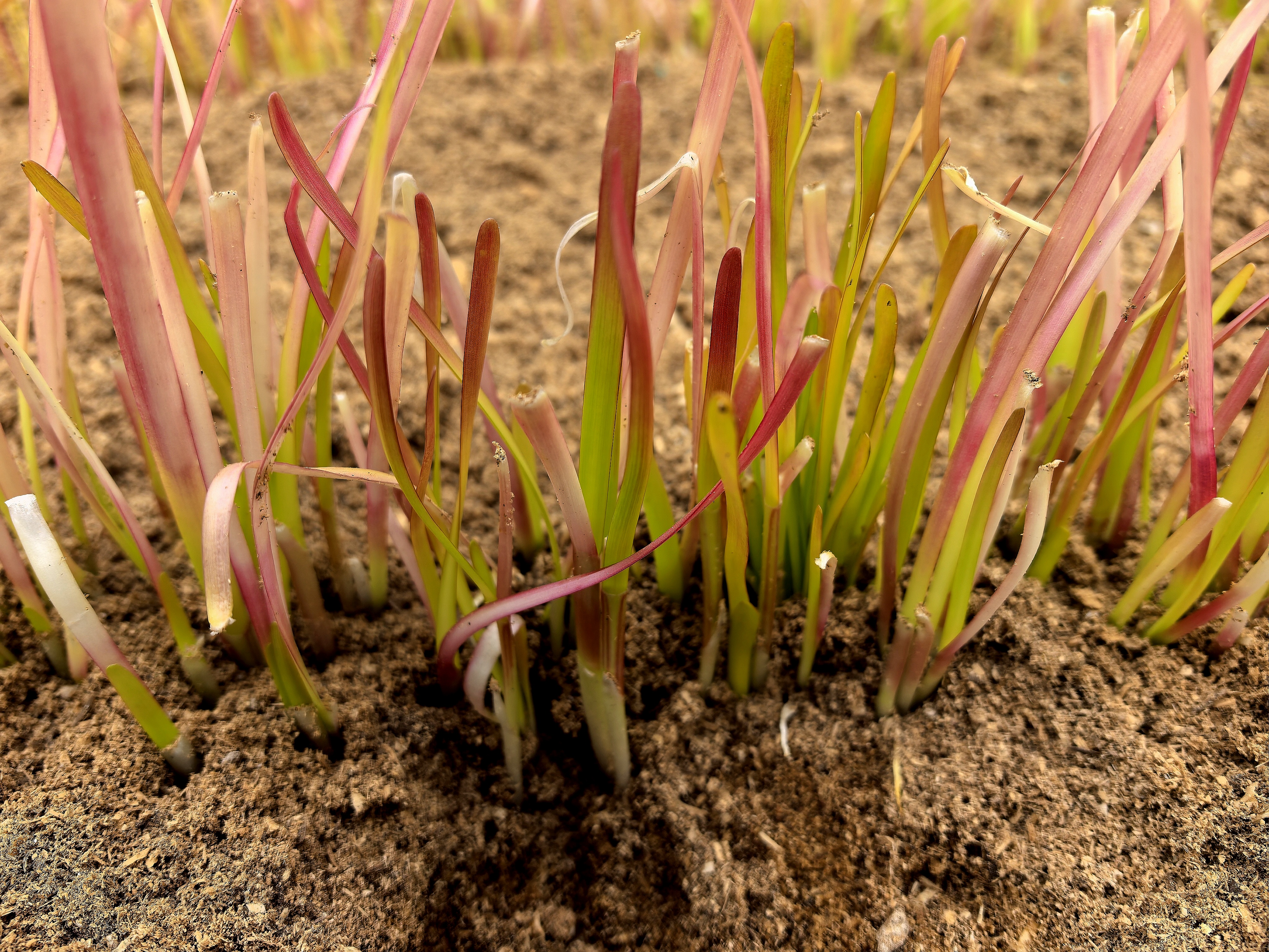 腊月十二,在北京市大兴区瀛海五色韭基地的一栋大棚内,一排排韭菜呈现出的渐变色彩格外引人注目,从根到梢,呈现出白、黄、绿、红、紫五色。记者走近一看,叶子的紫色部分仿佛冻伤一般,显得较为纤弱,但摸起来还是脆和硬挺的,这就是大兴区的特产五色韭。