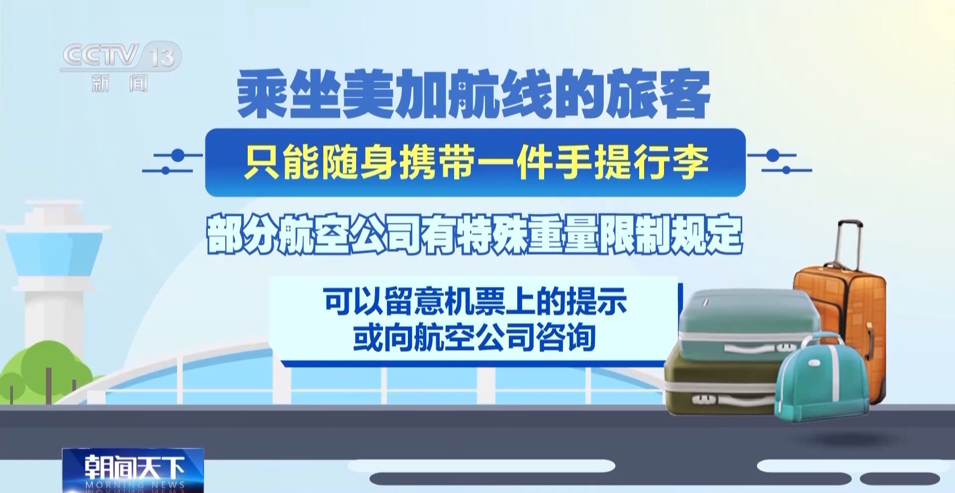 乘坐美加航线的旅客只能随身携带一件手提行李。部分航空公司有特殊重量限制规定,可以留意机票上的提示,或向航空公司咨询。