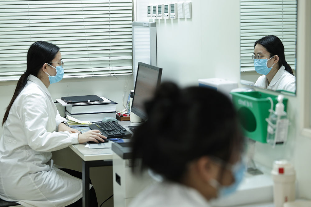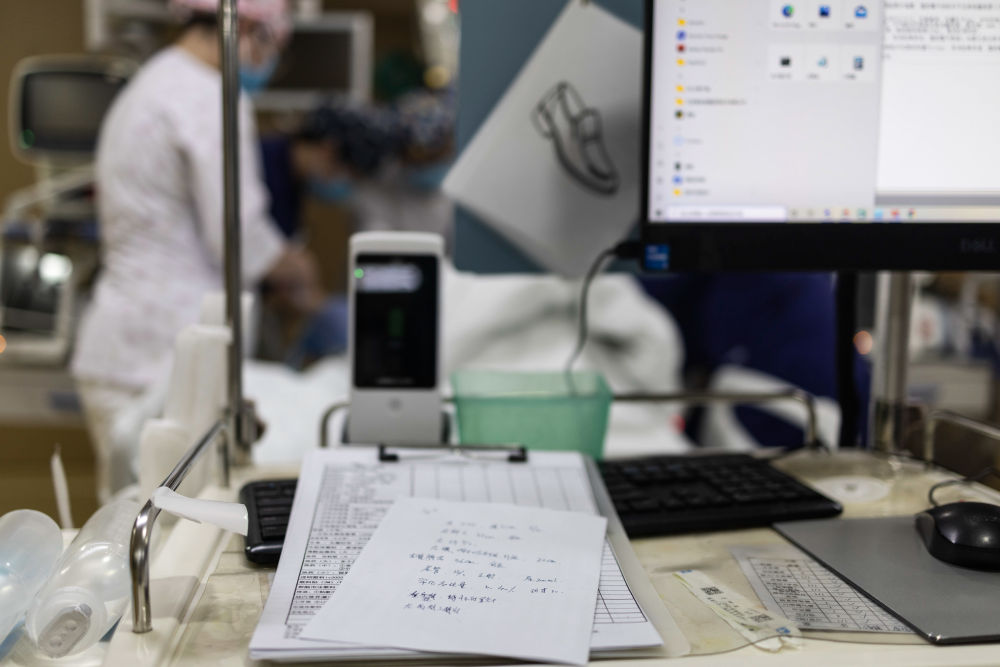 2月4日3时许,一名麻醉医生(左)和重症监护室医生交接患者病情。