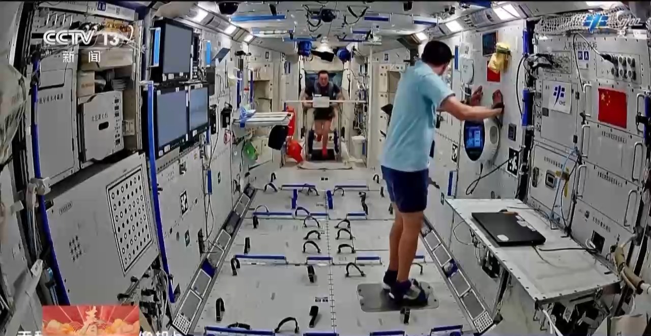 欢乐的文艺表演过后,航天员也要开展日常生活与工作,锻炼身体就是其中一项。
