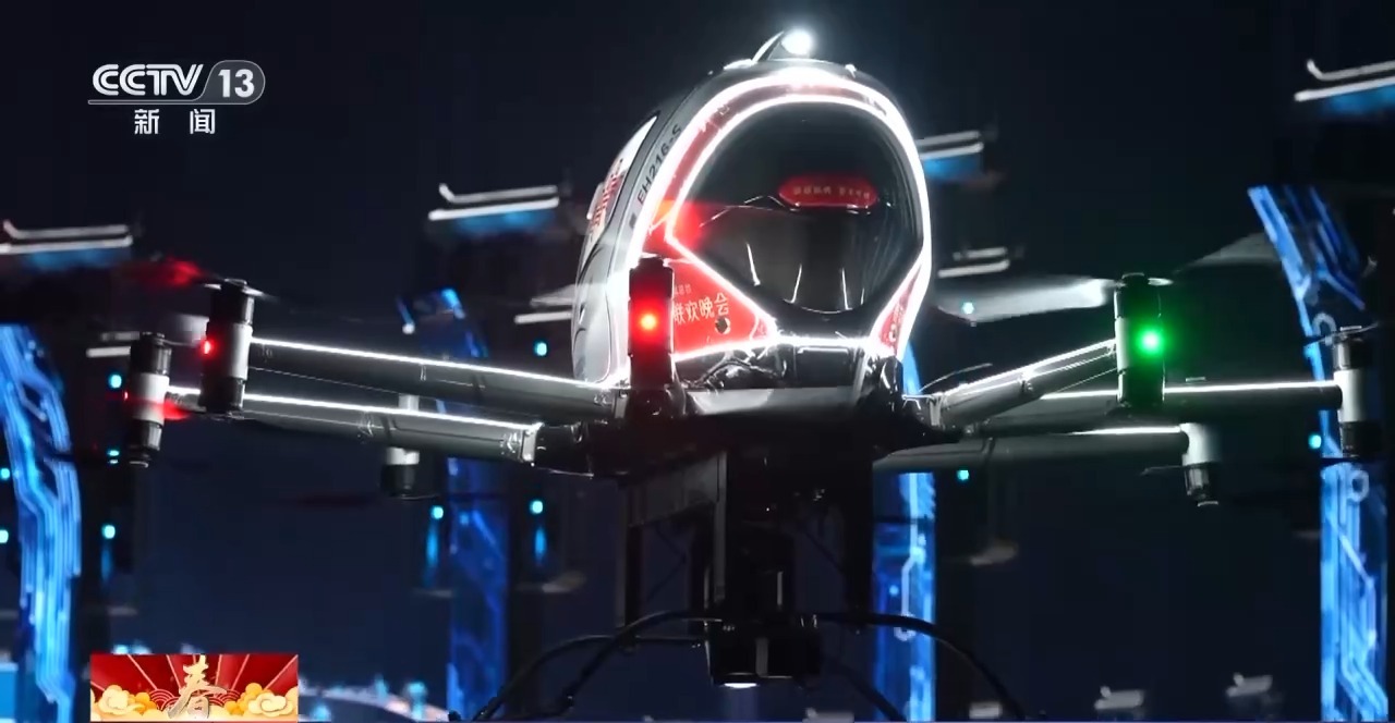 亿航智能首席技术官 冯帅:首先我们增加了一个支架,支架上装着整个舞台灯光的一套系统,我们在飞机飞行器舱内还放了两台移动电源,相当于把电池当货物、当乘客直接背上去的。