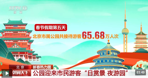 记者从北京市公园管理中心获悉,春节假期第五天,北京市属公园年味足、人气旺,共接待游客65.68万人次,游客量排名前三位的是天坛公园、颐和园、景山公园。