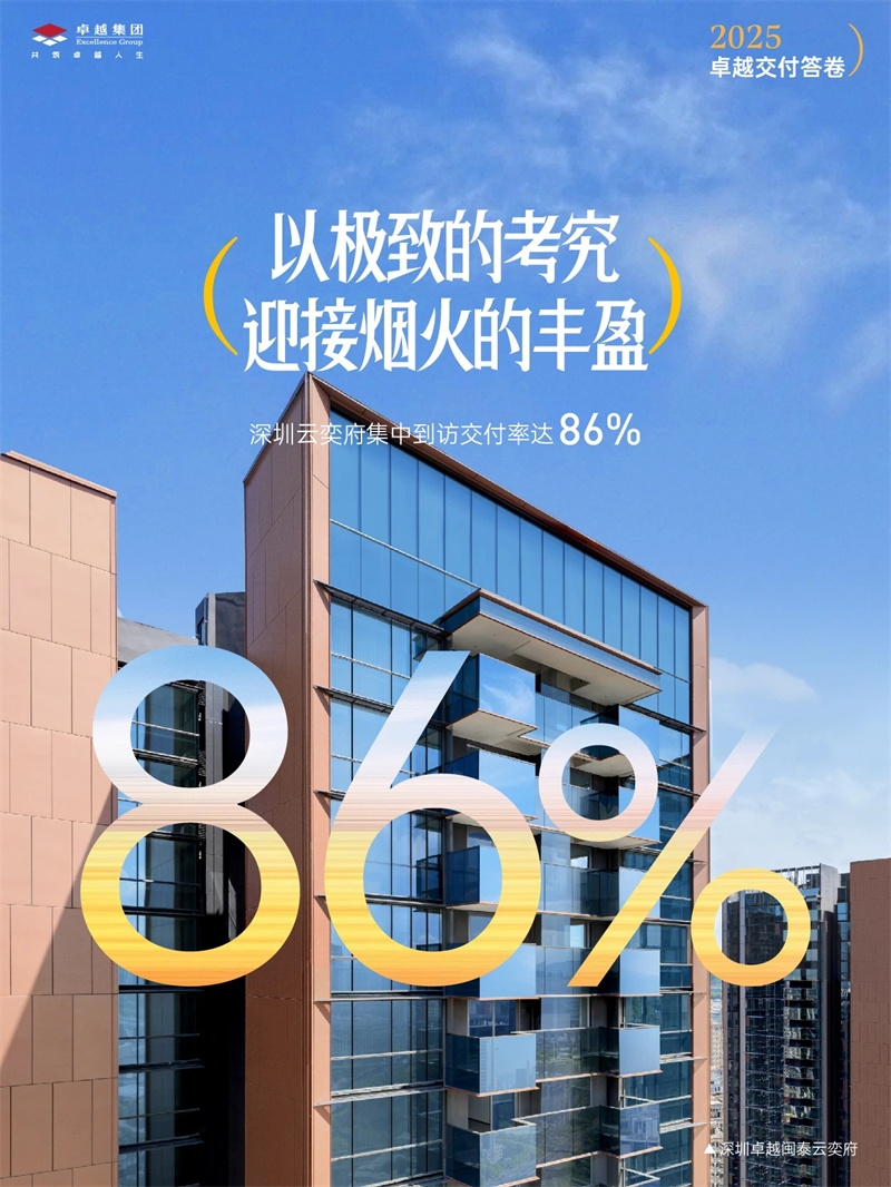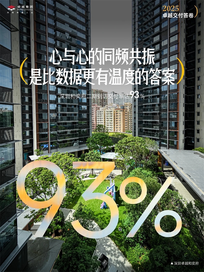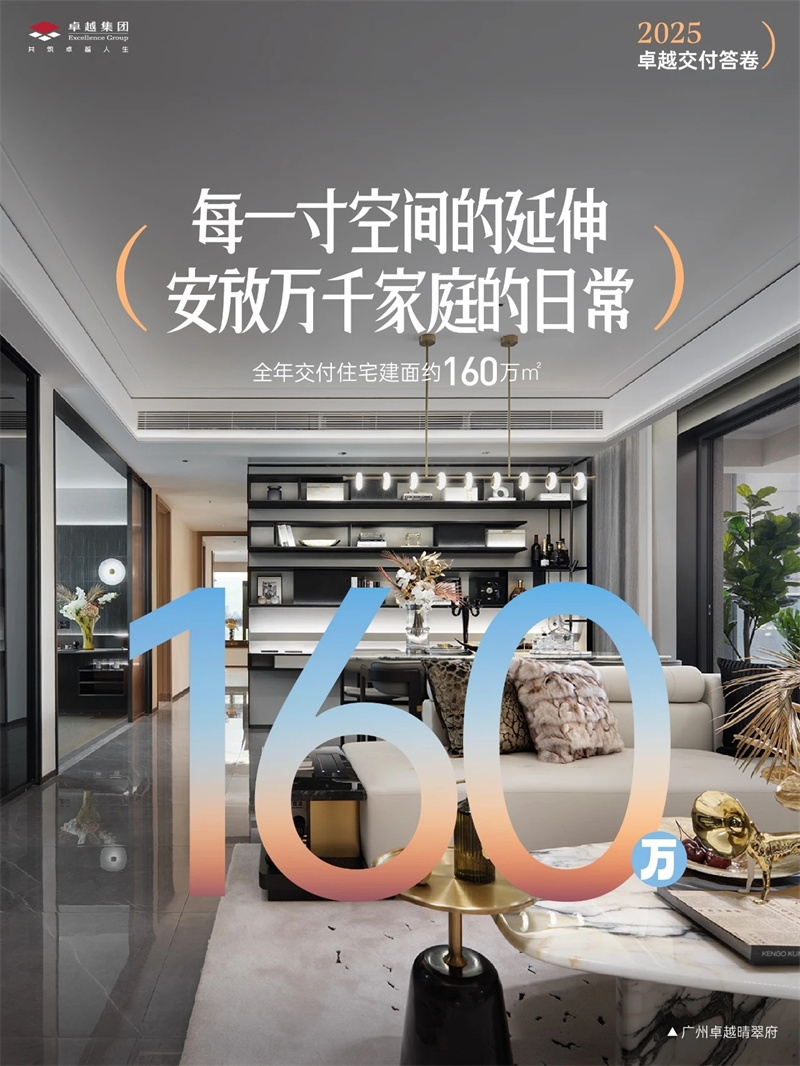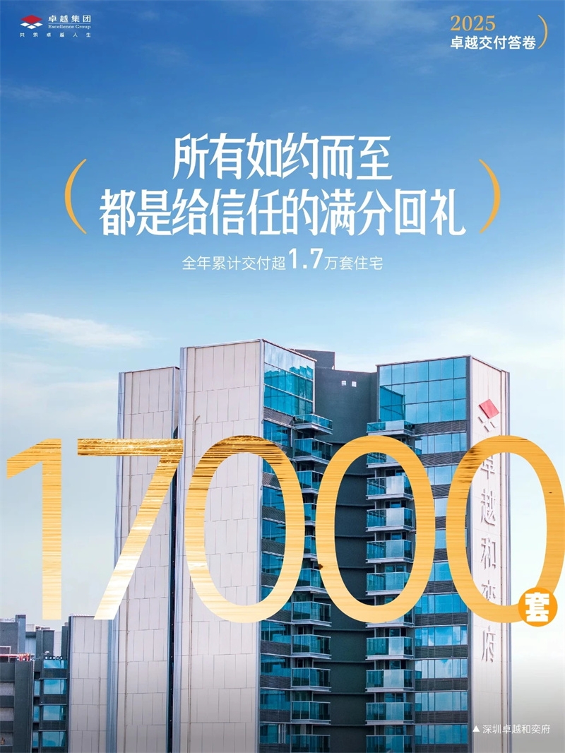 所有如约而至 都是给信任的满分回礼 #2025年卓越集团交付超17000套住宅 #覆盖全国22城的33个住宅项目 #荣登“中国房企超级交付力TOP20” 以约160万㎡的交付建面 在城市版图上绘就了一幅幅归家画卷 广州卓越晴翠府集中到访交付率超91% 荣膺「全国品质交付项目典范」 实现“交房即交证”,让幸福无需等待 深圳卓越和奕府二期到访交付率达93% 以高满意度,印证红盘的非凡号召力 深圳卓越闽泰云奕府作为“奕系”第三子 集中到访交付率约86%,诠释理想家境 以实力诠释责任,以品质兑现承诺 卓越始终步履不停 以品质兑现诺言,让理想生活触手可及 *推广