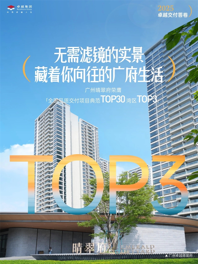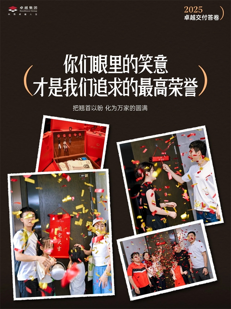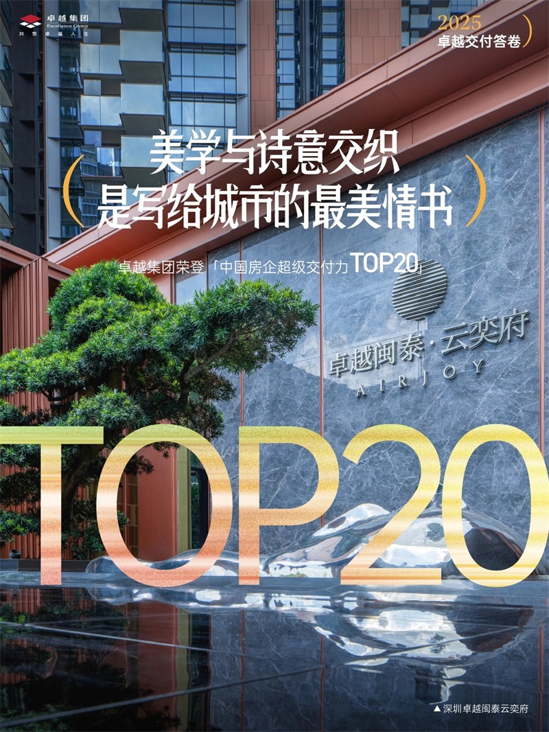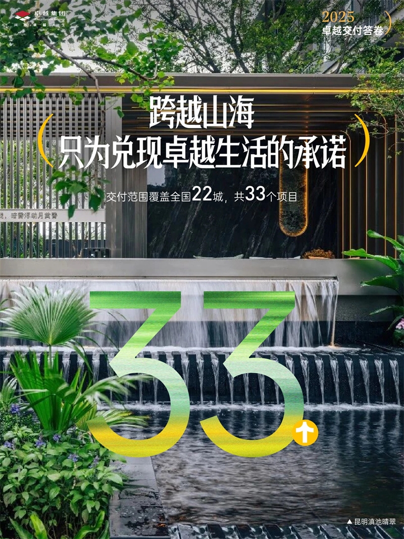 所有如约而至 都是给信任的满分回礼 #2025年卓越集团交付超17000套住宅 #覆盖全国22城的33个住宅项目 #荣登“中国房企超级交付力TOP20” 以约160万㎡的交付建面 在城市版图上绘就了一幅幅归家画卷 广州卓越晴翠府集中到访交付率超91% 荣膺「全国品质交付项目典范」 实现“交房即交证”,让幸福无需等待 深圳卓越和奕府二期到访交付率达93% 以高满意度,印证红盘的非凡号召力 深圳卓越闽泰云奕府作为“奕系”第三子 集中到访交付率约86%,诠释理想家境 以实力诠释责任,以品质兑现承诺 卓越始终步履不停 以品质兑现诺言,让理想生活触手可及 *推广