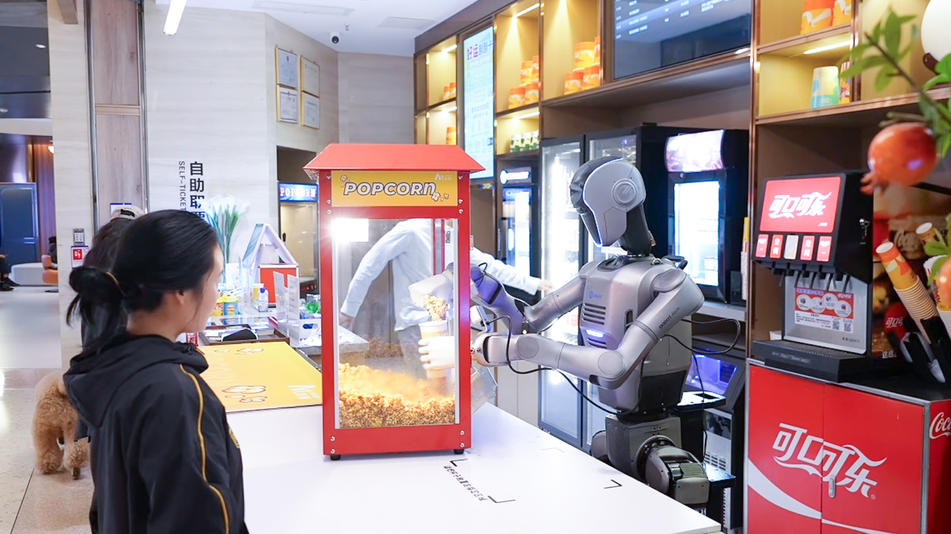 如今,这台搭载自研端到端模型的机器人,能从容应对爆米花柜台工作的各种变数。哪怕顾客临时移动杯子,机械臂也能快速调整动作,精准完成服务。