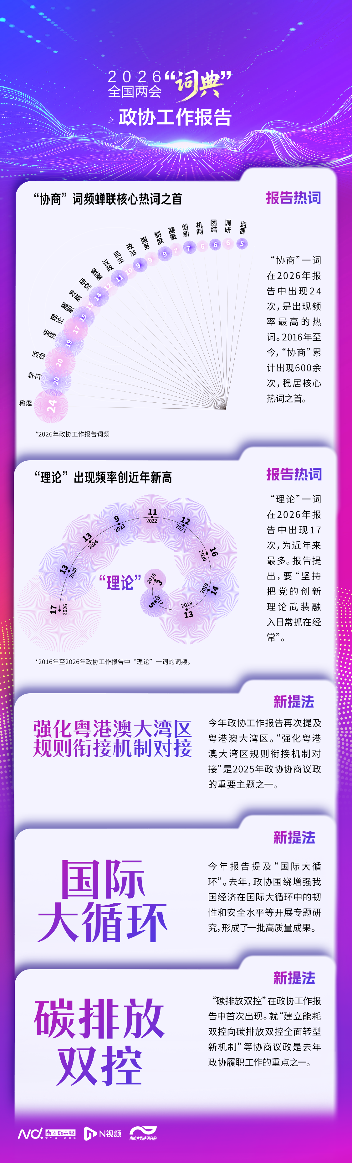 报告新词展现了全国政协工作新动态和新征程。南都大数据研究院梳理发现,今年的政协工作报告也出现了多个新提法,如“强化粤港澳大湾区规则衔接机制对接”“国际大循环”“碳排放双控”等。