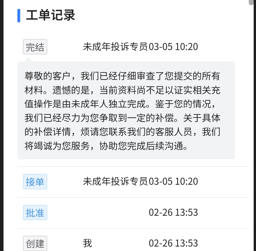 湖南湘西69岁的谭姓老人也遭遇类似情况,其11岁的孙子趁家人疏于看管,通过转钱给同学、由同学代充的方式,在该游戏中充值超3700元,老人银行账户总计支出4000多元,游戏账号还出现被盗情况。老人的孙女李雨(化名)于1月28日提交退款申请,工单却莫名消失,2月9日重新提交材料后,截至3月12日仍无任何处理进展。李雨说,家人对弟弟疏于监管,自身也有责任,因而并不纠结最终能退多少钱。李雨对南都记者说:“我们主要是希望能规范弟弟的游戏消费行为,只要平台能按规定流程处理,退多少我们基本都能接受。”