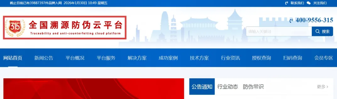 1月17日,有网民通过中央网信办违法和不良信息举报中心(下称举报中心)官网举报,反映名为“全国质量监督防伪系统”“中国产品监督315防伪查询系统”“315产品防伪查询中心”“全国产品质量12315防伪查询系统”等4家网站,使用“315”或“12315”数字注册域名,网站内容展示“国家某某平台”“全国某某平台”“315”等名称标识,并在搜索引擎上进行推广,通过定制所谓的“国家级溯源防伪标签”牟利,存在误导消费者的行为。
