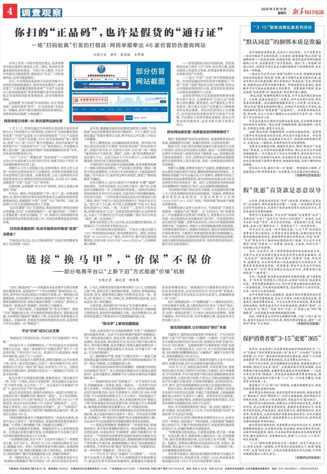在消费场景日益多元化的今天,“扫码验真”不该成为消费者一场碰运气的“赌博”。从“扫码安心”到“消费放心”,不仅需要相关监管部门持续发力,更需要全社会共同织就一张让假冒伪劣无处藏身的“防护网”。“欢迎更多网民成为我们的‘眼睛’,发挥共治的作用,共同守护清朗的网络消费环境。”刘涵表示,举报中心将持续畅通网络举报渠道,为消费者提供更多元、便捷的举报途径,强化仿冒假冒网站识别科普宣传,不断提升消费者的防范意识和辨别能力。同时,市场监管部门也将持续开展防伪查验网站信息监测,加强合规防伪查验渠道信息的发布,宣传和普及防伪知识,提升全社会防伪意识。