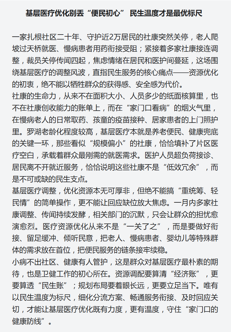 针对莲花、田贝等小型社康关停一事,深圳市卫健委指出此为罗湖区结合辖区医疗规划、提升资源利用率的自主举措,符合该区医疗卫生“十五五”规划思路。并强调各区推进社康资源优化时,必须坚守以人民健康为中心,严守服务连续性底线,全力保障居民诊疗平稳过渡。