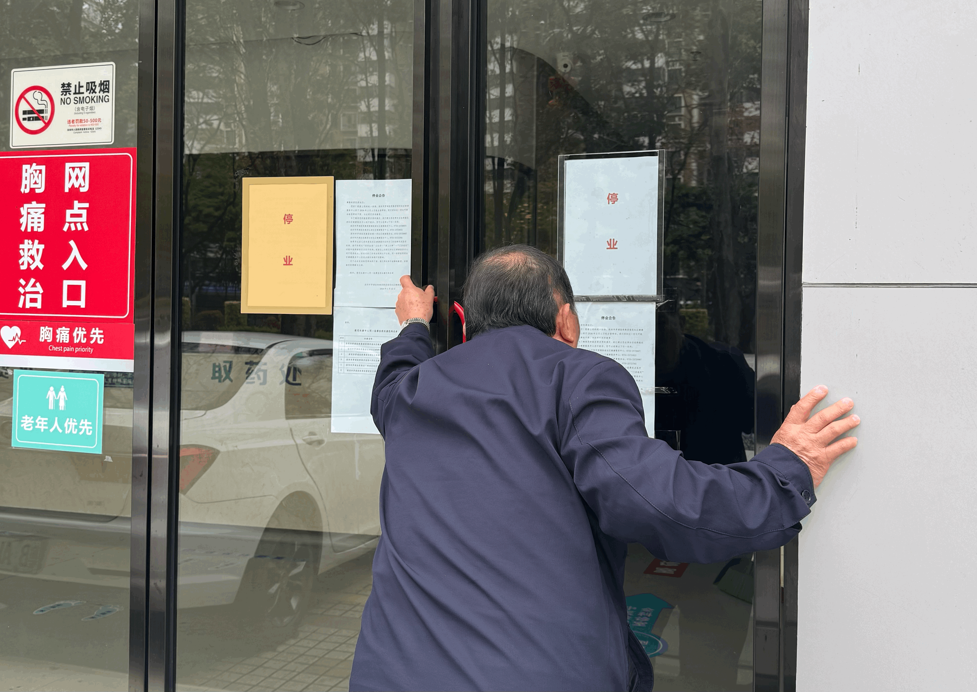 3月3日,莲花社康中心门口,一名老人在阅读停业通知。