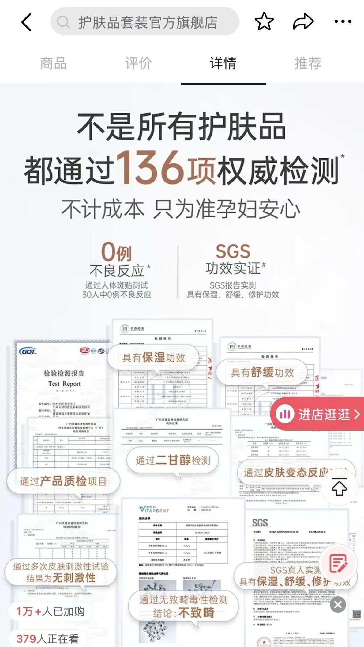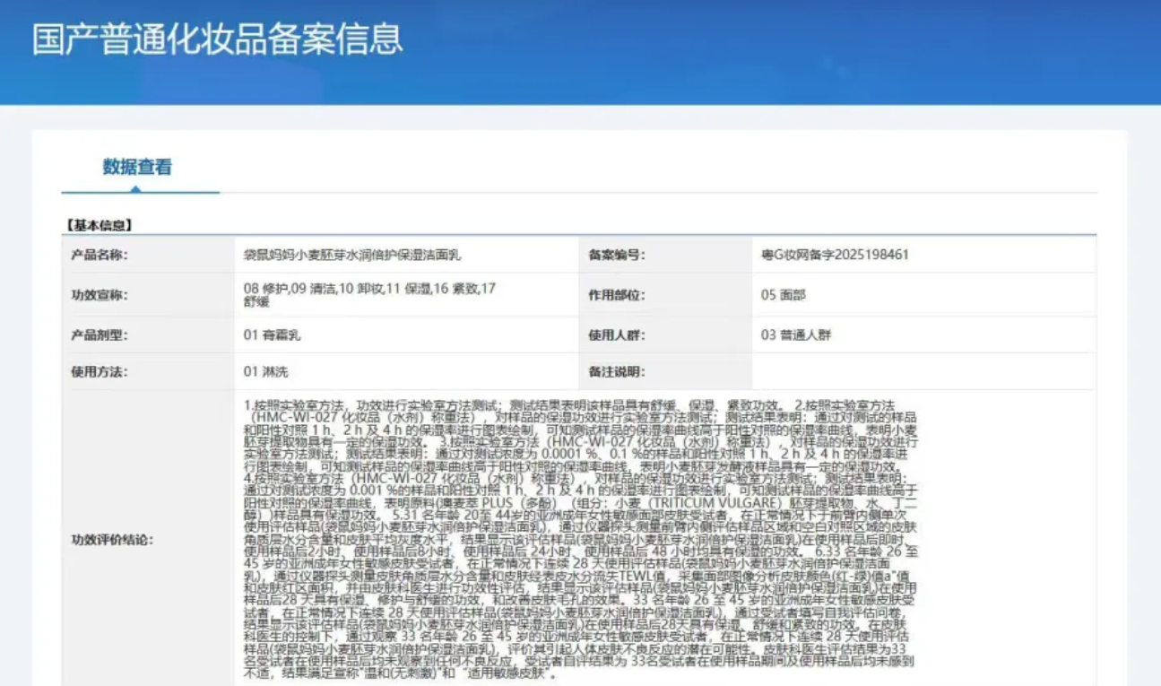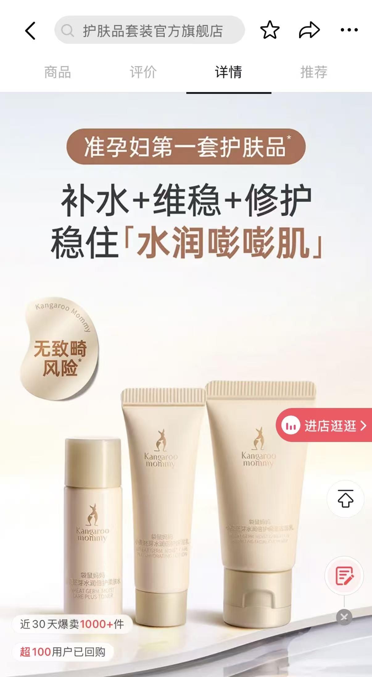 以袋鼠妈妈主推的小麦礼盒系列产品为例,产品包括小麦胚芽水润倍护柔肤水、保湿乳、洁面乳等,其页面详情宣称“准孕妇第一套护肤品”“只为准孕妇安心”。但有媒体查询国产普通化妆品备案信息发现,上述产品备案编号均明确显示为国产普通化妆品,使用人群一栏标注为“03普通人群”,并无任何“孕妇”“备孕人群”相关标注。