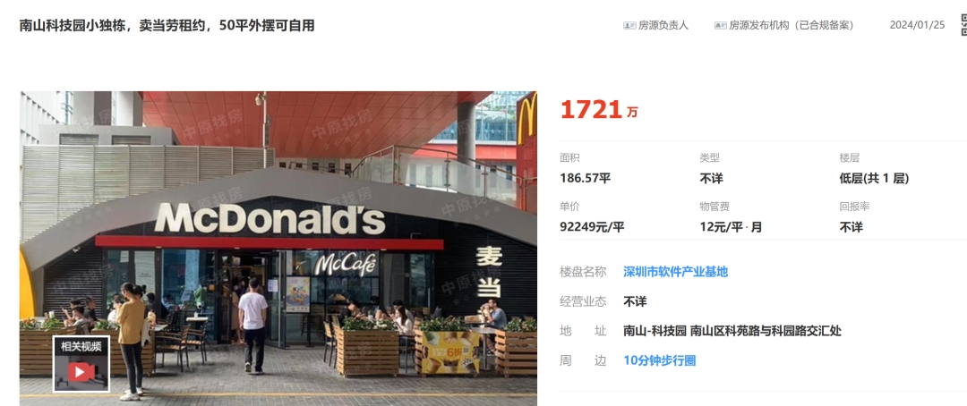 中原地产数据显示,在南山科技园腾讯总部旁边一套约186㎡的临街商铺,月租金超12万元,单价约667元/㎡·月,在经济下行期也表现出了相当强的稳定性。