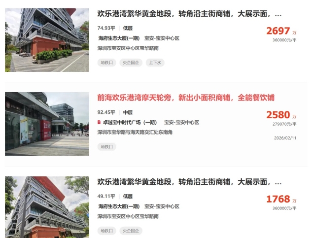 以宝安中心区为例。中原地产数据显示,目前宝安中心区的优质项目单价多在8-10万/㎡,但欢乐港湾繁华黄金地段的转角沿主街商铺的均价已经达到了36万/㎡,一套74.93平的商铺售价达到了2697万。