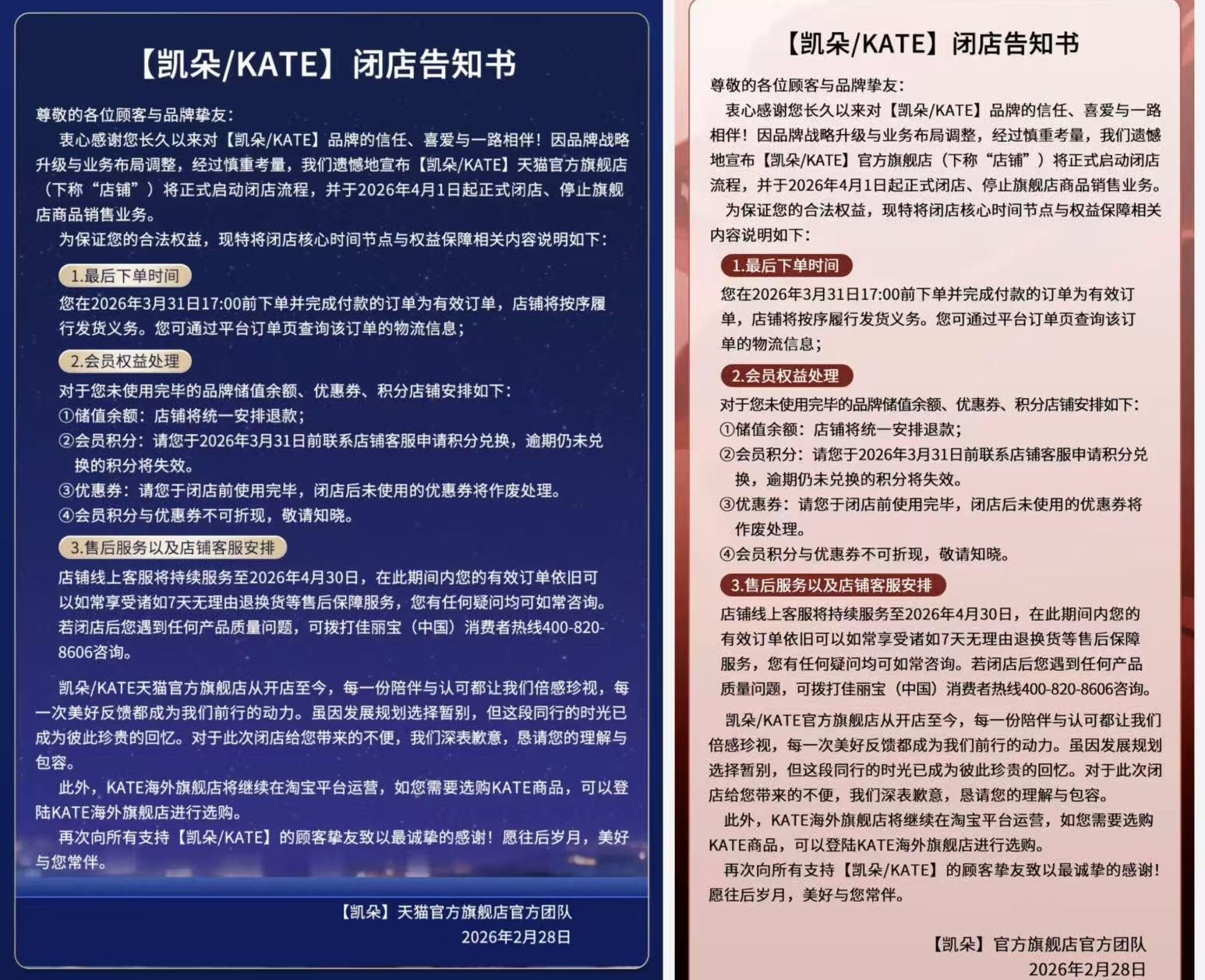 根据KATE发布的闭店告知书,持有品牌积分、储值余额尚未使用的用户,需在2026年3月31日前联系客服申请积分兑换、余额原路退回;店铺线上客服将持续服务至2026年4月30日,在此期间的有效订单仍可享受7天无理由退换货等售后保障,相关消费疑问均可如常咨询。