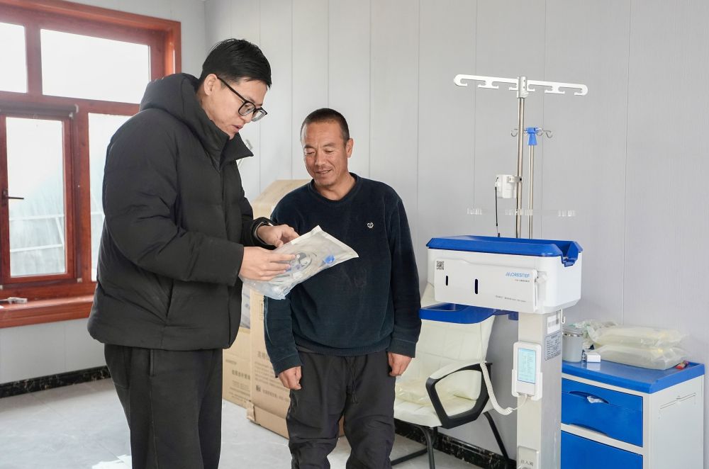 2月2日,宁夏固原市原州区彭堡镇惠德村驻村帮扶工作队工作人员为村民马文军(右)讲解租用的医疗器械及配套耗材的使用方法。新华社记者 杨植森 摄