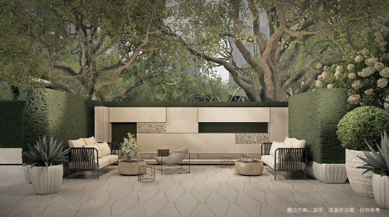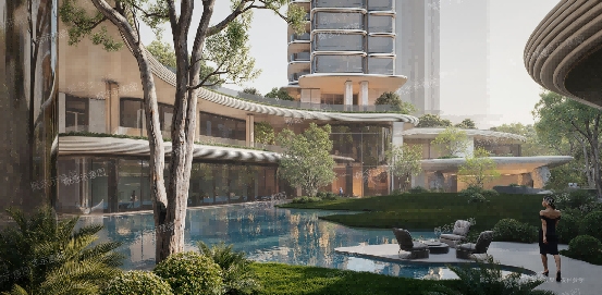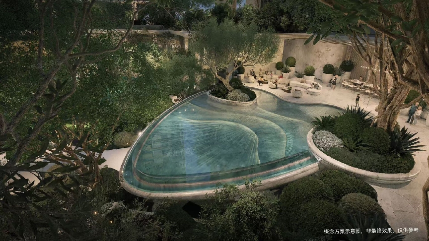 二层打造全龄活动空间,中央有约170方的儿童戏水池,用珠光贝母铺底,远望悬浮半空如珍贵的蓝宝石,因此也称之为“蔚蓝宝石”,是园林的点睛之笔,与戏水池无缝衔接的儿童乐园,是社区的活力心脏,家长可以在孩子玩水的时候,在旁边喝杯咖啡、和朋友聊天;晚上可以在这里办一场星空派对,让社交成为璀璨的日常仪式。
