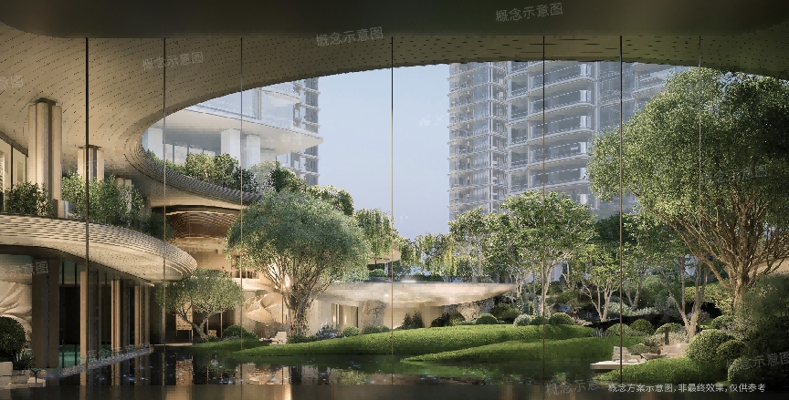 深圳观潮项目创新性打造约8万㎡超级底盘,含约5.3万㎡立体景观、约1.8万㎡花园漫街、约5500㎡圈层会所。超级底盘通过空中连廊与片区世界级艺文配套连接(具体以政府建设为准),将滨海客流、酒店及商务客流、社区居民等多类人群动线有机串联。这里不再只是住区,而是能够激活整片区域的“城市立体社区”——它向内生长,向外延伸,成为繁华与静谧之间的柔软过渡。