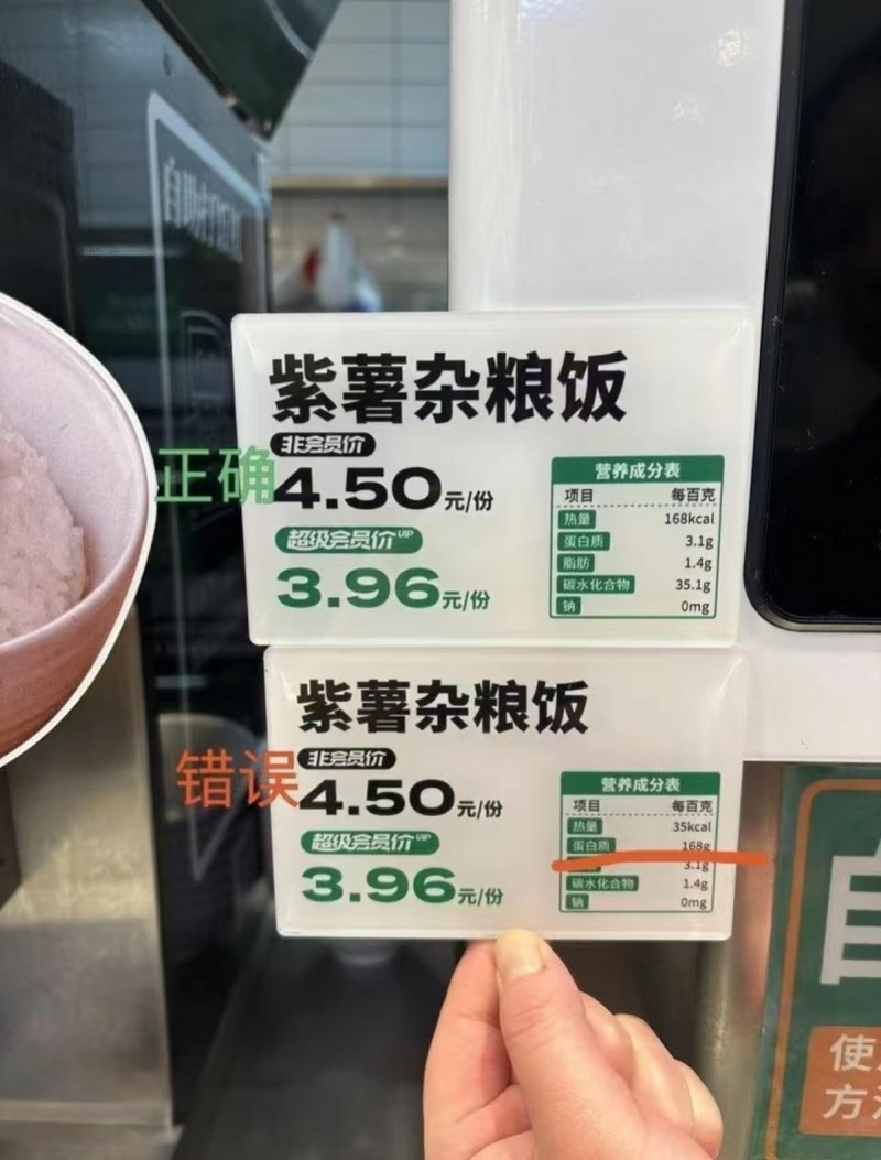 每百克杂粮饭含168克蛋白质?3月19日,有网友发帖称,中山石岐万象汇老乡鸡门店内紫薯杂粮饭的营养成分价格牌存在明显错误,标注“每百克含168克蛋白质”。对此,门店工作人员表示,价格牌错误是数字排列错位所致,目前新价格牌正在快递路上。