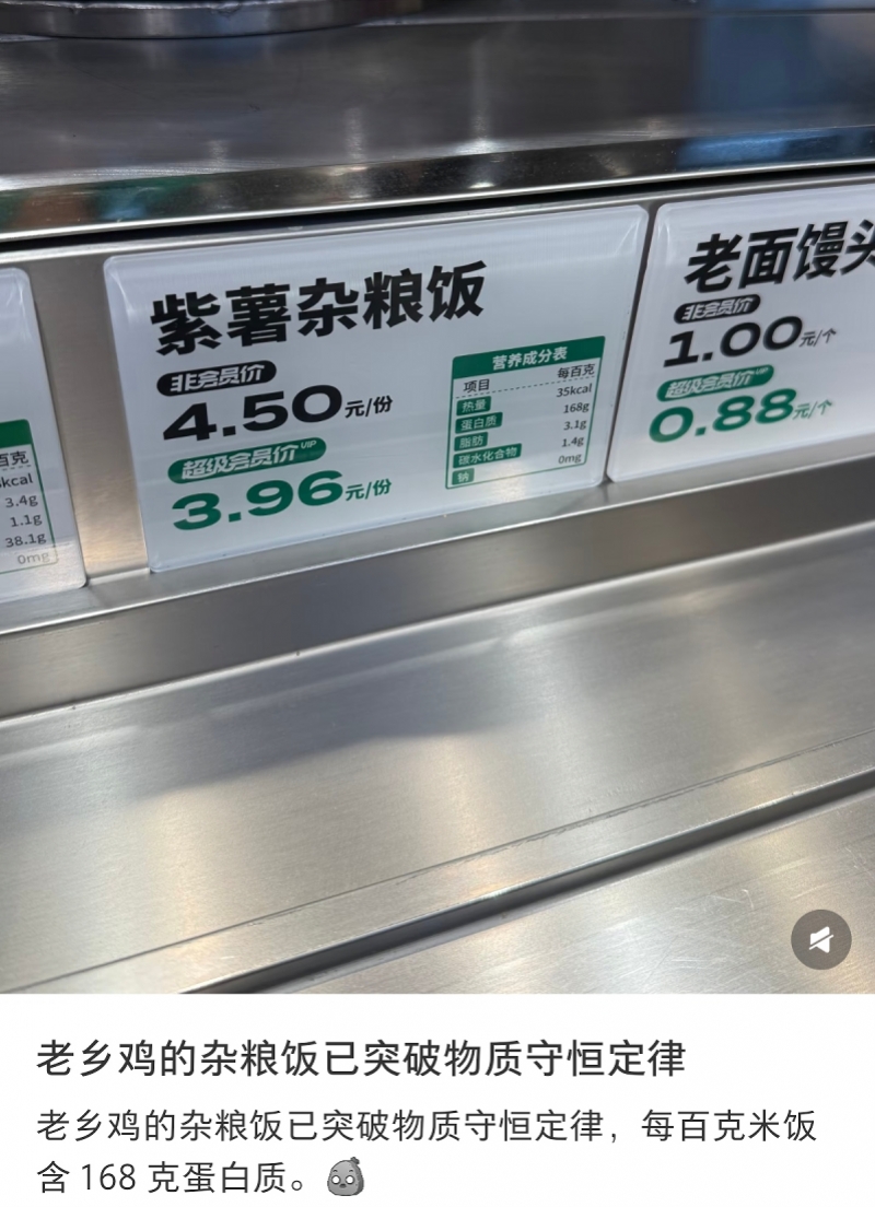 3月19日,有网友发帖调侃:“老乡鸡的杂粮饭已突破物质守恒定律,每百克米饭含168克蛋白质。”原来,是该网友在中山石岐万象汇老乡鸡门店就餐时发现,店内紫薯杂粮饭的营养成分价格牌存在明显错误:标注“每百克含168克蛋白质”。