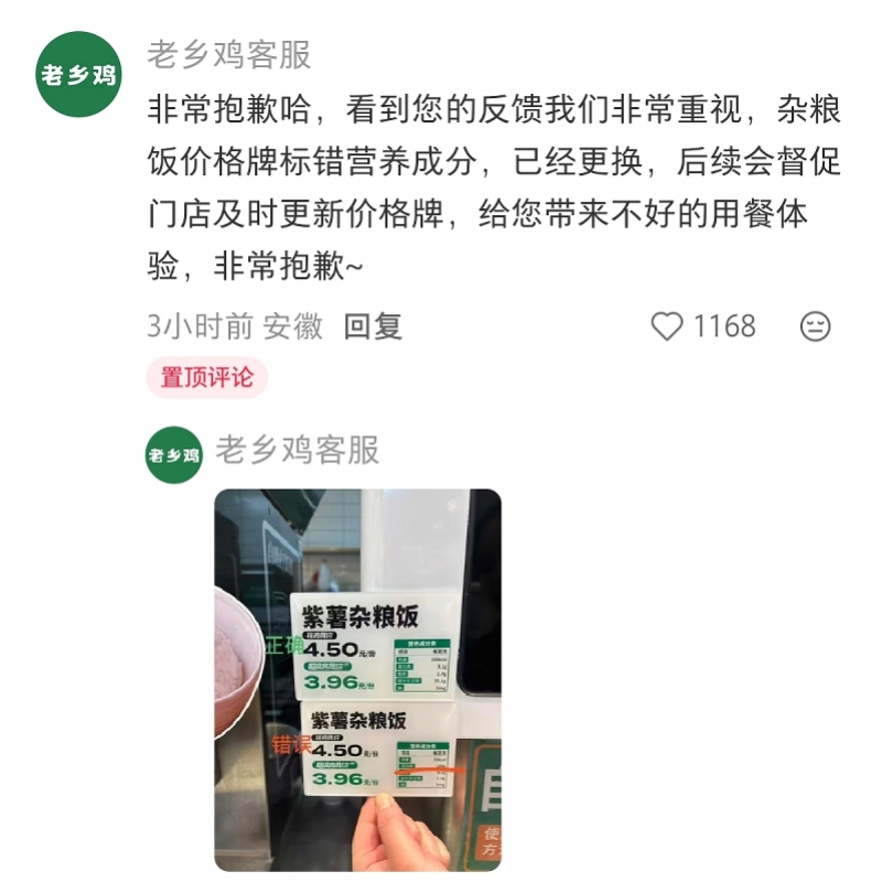 记者注意到,“老乡鸡客服”账号在该帖子下留言表示,杂粮饭价格牌标错营养成分,后续会督促门店及时更新价格牌。该账号还回复了正确价格牌与错误价格牌的对比图,正确的价格牌标注为每百克含:热量168kcal,蛋白质3.1g,脂肪1.4g,碳水化合物35.1g,钠0mg。