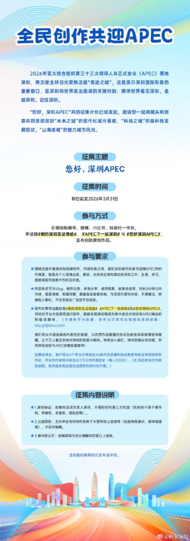 从科技创新到绿色生态,从城市天际线到街巷烟火气,中外主播们用镜头串联起深圳的AB面——既是创新的高地,也是生活的乐园。正如活动主题所言:“APEC:下一站,深圳!”这座城市已准备好向世界展示它的精彩,而每一个手持镜头的你,都可以成为这场展示的参与者。带上话题#APEC下一站深圳##相约深圳见证奇迹##您好深圳APEC#发布原创视频,让我们一起讲述深圳故事,让世界听见中国声音。
