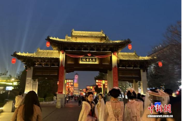 图为洛邑古城景区前穿着汉服的游客。 谢艺观 摄