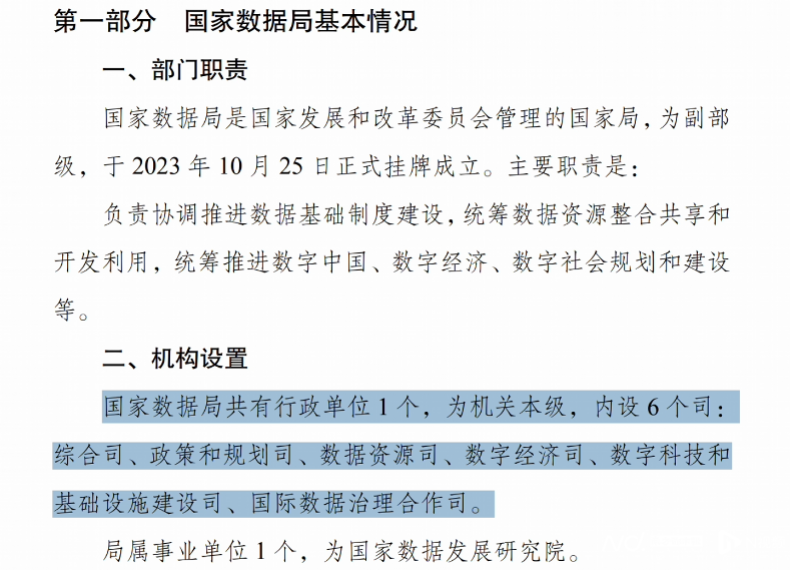 官网信息显示,国家数据局此前已设立5个司局:综合司、政策和规划司、数据资源司、数字经济司、数字科技和基础设施建设司。局属事业单位1个,为国家数据发展研究院。
