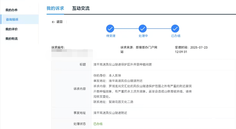 去年7月,刘先生曾通过民意诉求网站提交了投诉,明确反映凤仪山隧道上方存在严重违规开垦现象,已造成水土流失,存在山体滑坡坍塌风险,诉求相关部门尽快查处复原、消除隐患。