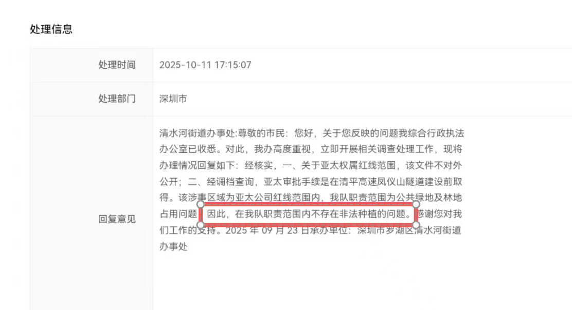 在之后的正式回复中,清水河街道办事处还补充了两点说明:其一,关于亚太公司权属红线范围的相关文件,不对外公开;其二,经调档查询,亚太公司的相关审批手续,是在清平高速凤仪山隧道建设前取得的,涉事区域为该公司红线范围内。