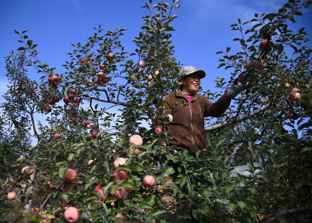 果农在陕西省榆林市横山区赵石畔村一处果园采收苹果(2025年11月4日摄)。新华社记者 张博文 摄