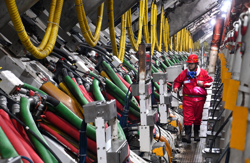 工作人员在陕西陕煤曹家滩矿业有限公司全自动液压支架支撑的采煤工作面巡检(2024年2月29日摄)。新华社记者 邹竞一 摄