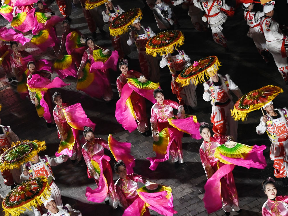 演员在榆林老街非遗大集开集仪式上表演秧歌腰鼓(2023年2月17日摄)。新华社记者 邹竞一 摄